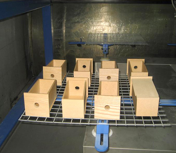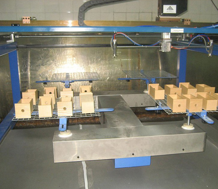 该机型为五轴四喷盘往复机下图为木盒喷涂,四喷盘是两盘同时喷涂,比双盘的效率提高一 倍; 喷涂圆或方形产品时,喷枪可以左右或前后或上下移动喷涂,保.证产品膜厚均匀; 。